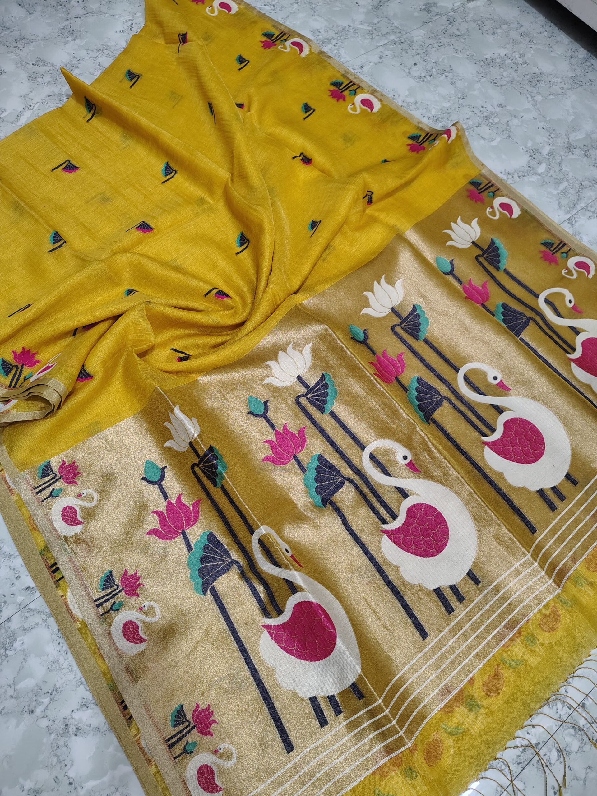 This is a silk and linen saree, it has a tissue effect. The poithani-like pallu makes the saree more attractive.