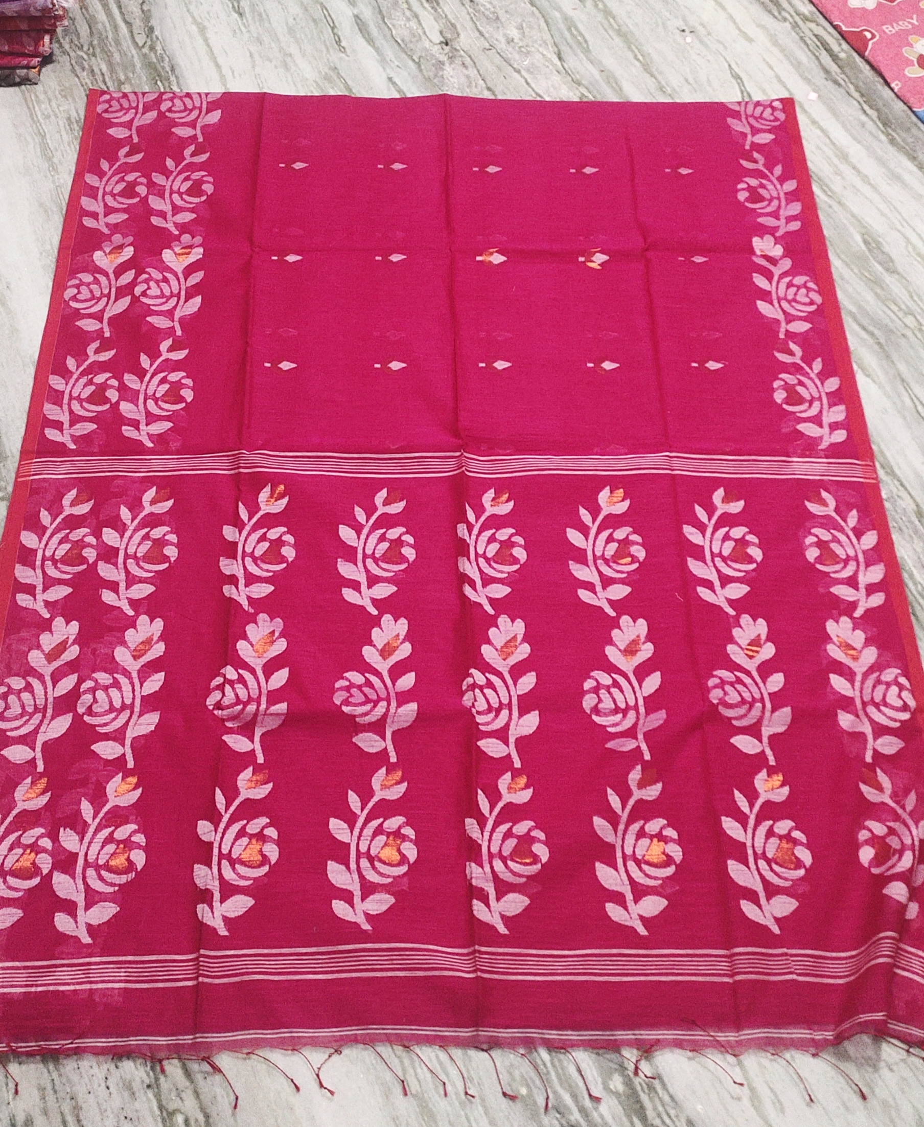It’s rani in colour slab khadi saree.it has skirt boarder on lower part with mina kari rose weaving.The rose pattern adorning the pallu area of this saree is a beautiful touch.