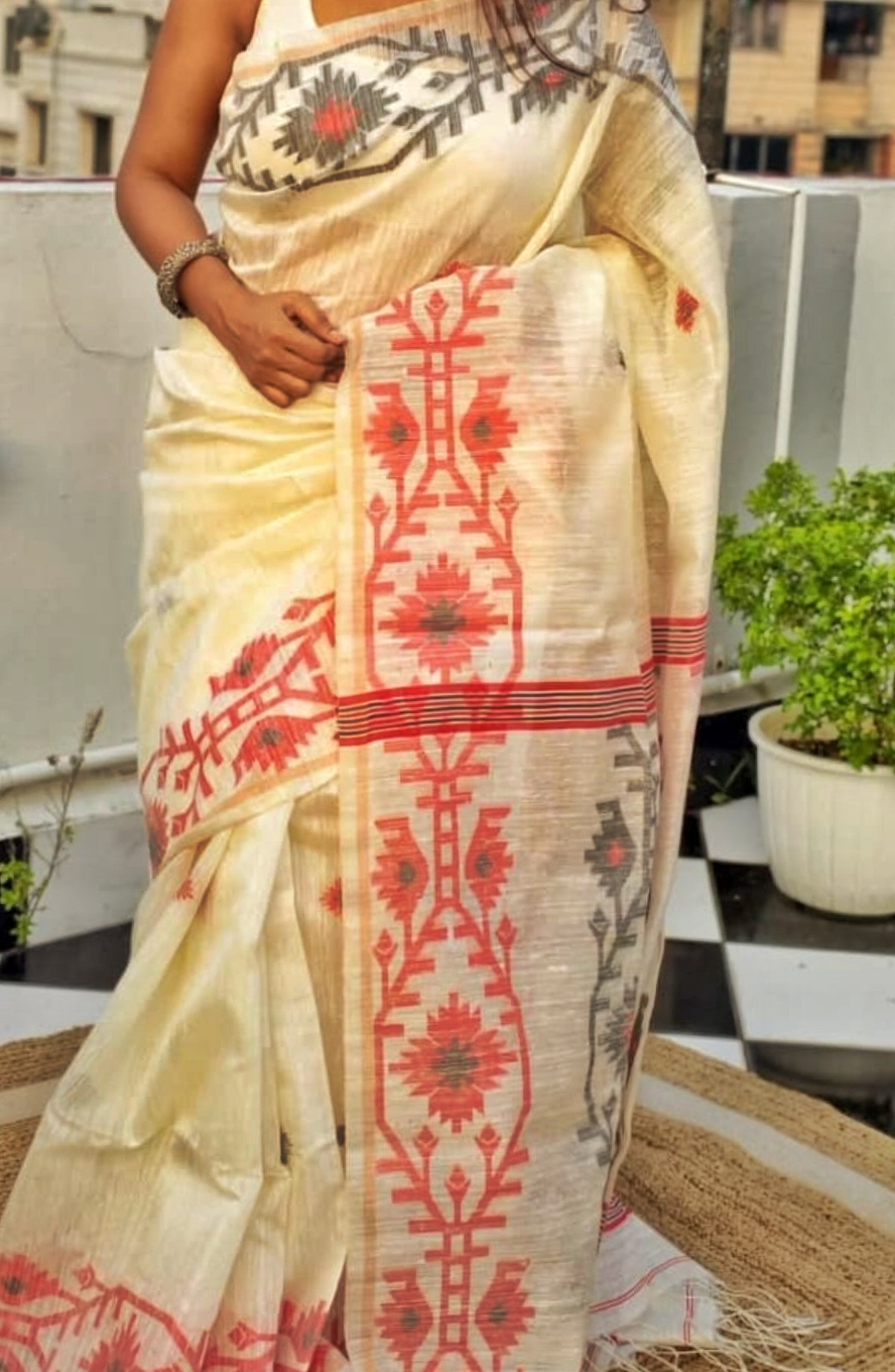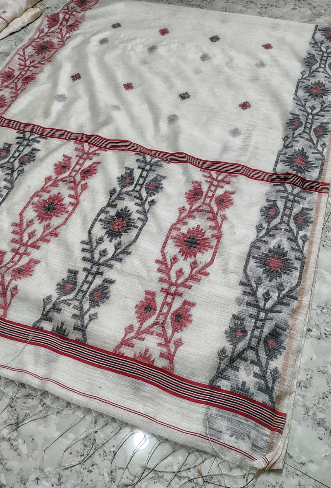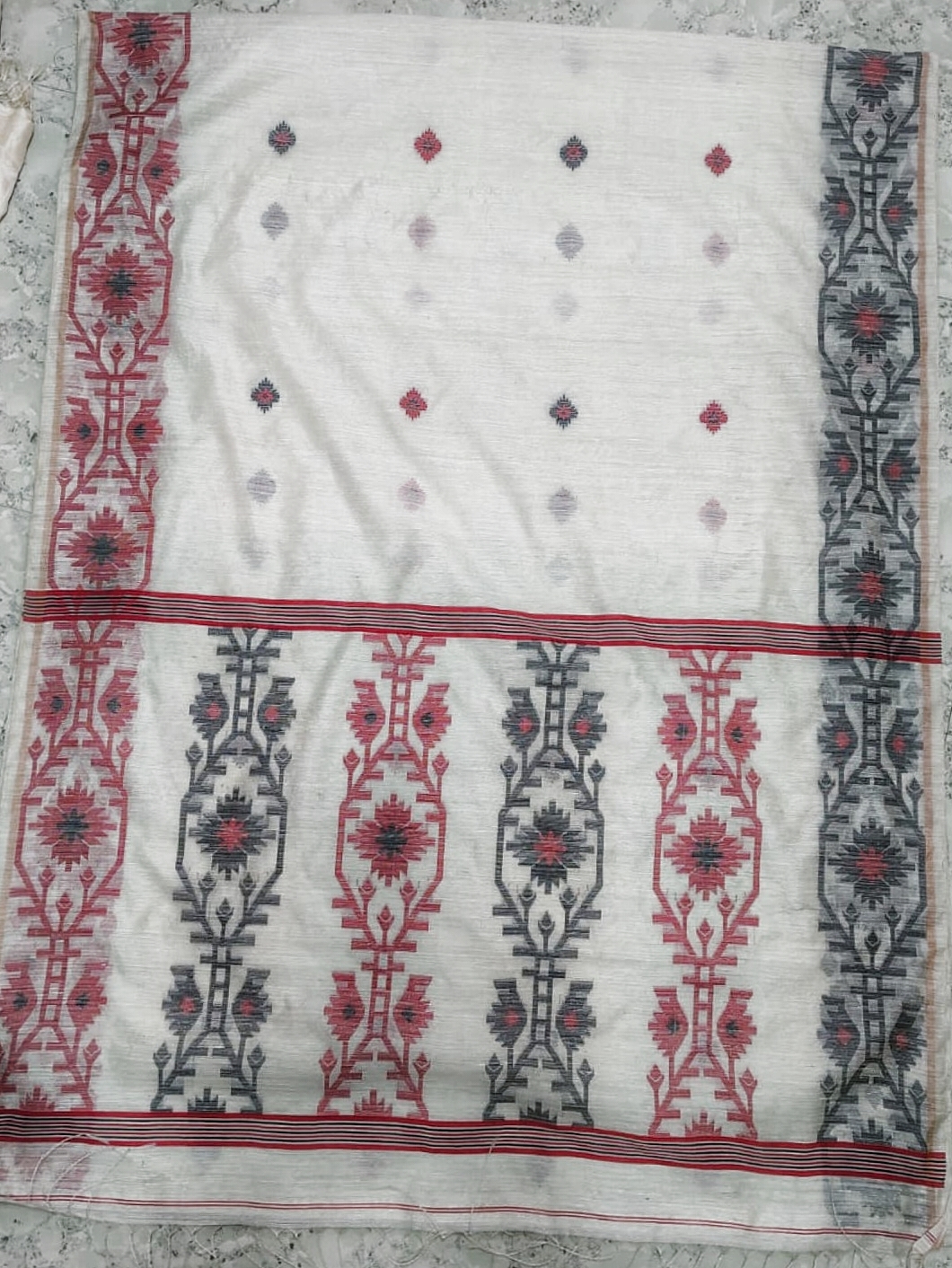 It’s white pure matka silk saree with dhakai pattern ganga jamuna boarder.its beautiful boarder and attractive pallu provide you elegant look.